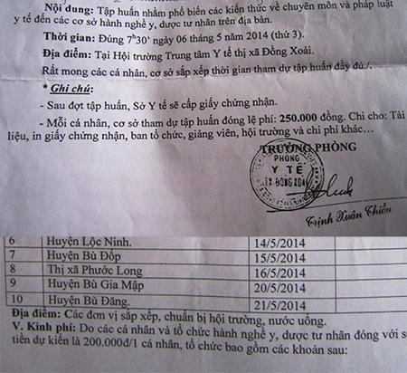 Ngày 4-4-2014, Sở Y tế tỉnh Bình Phước có văn bản gửi các phòng y tế trong tỉnh kế hoạch tổ chức tập huấn triển khai văn bản quy phạm pháp luật liên quan đến ngành y cho các cá nhân, tổ chức hành nghề y, dược tư nhân trên địa bàn. Theo kế hoạch, từ ngày 6-5, Sở Y tế sẽ tập huấn cho bảy huyện và ba thị xã trên toàn tỉnh về Luật Khám bệnh, chữa bệnh; thông tư của Bộ Y tế, nghị định của Chính phủ liên quan đến ngành y… Mục đích của đợt tập huấn là giúp cá nhân, tổ chức hành nghề y, dược tư nhân nắm nội dung cơ bản của các văn bản pháp luật để thực hiện. Tuy nhiên, Sở Y tế tỉnh Bình Phước lại ghi rõ: Kinh phí do các cá nhân, tổ chức hành nghề y, dược tư nhân phải đóng với số tiền dự kiến là 200.000 đồng/cá nhân, tổ chức. Và kế hoạch này được phòng y tế các huyện, thị thực hiện nghiêm!