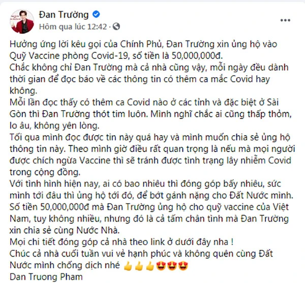 Đan Trường đóng góp và kêu gọi đóng góp vào Quỹ vaccine của Chính phủ. Ảnh: FBNV