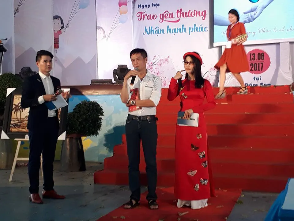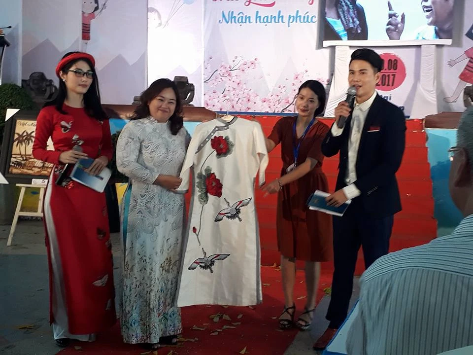 Vị mạnh thường quân chiến thắng đấu giá chiếc áo dài thêu và hai MC Diễm My 9X và Vũ Mạnh Cường.