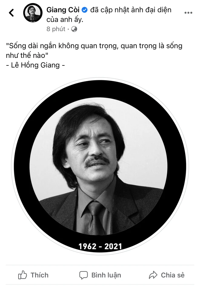Trên trang fanpage chính thức của nghệ sĩ Giang Còi đã thay bức ảnh tiễn biệt người nghệ sĩ tài hoa của màn ảnh Việt cùng lời chia sẻ: "Sống dài ngắn không quan trọng, quan trọng là sống như thế nào".