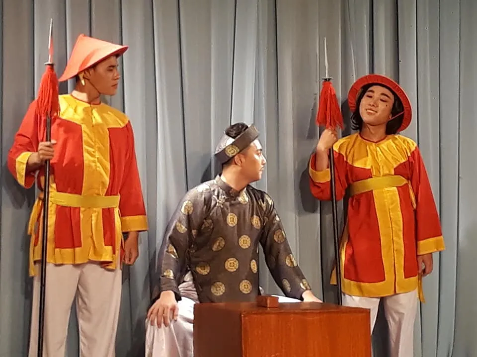 Các diễn viên trẻ khiến khán giả cười bò lăn với tiết mục Tiếng trống thăng đường.