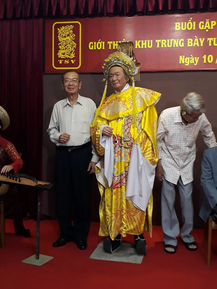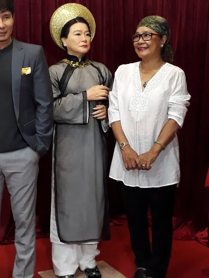 Nghệ sĩ gạo cội Lê Thiện bên bức tượng của bà.
