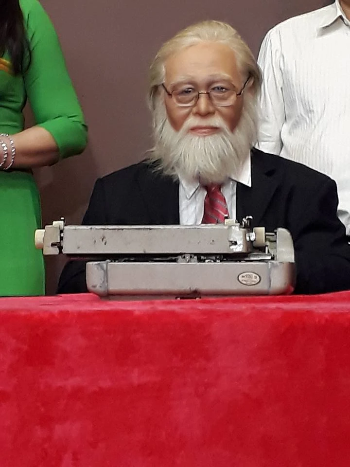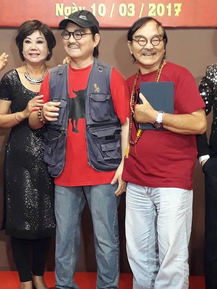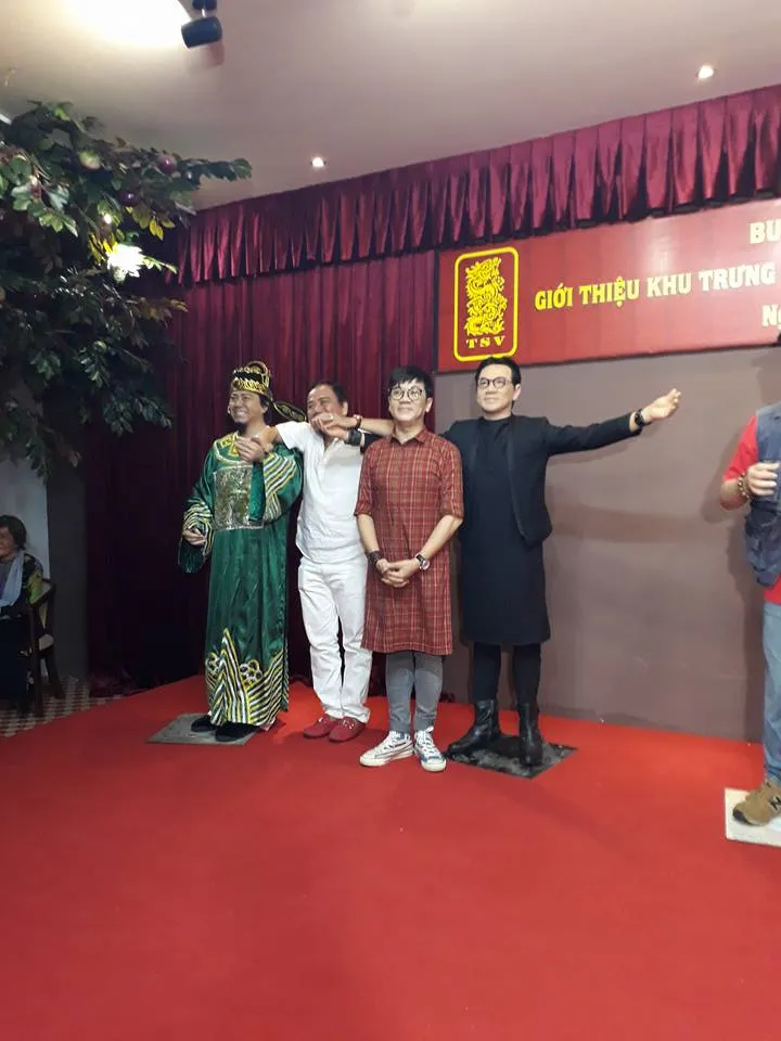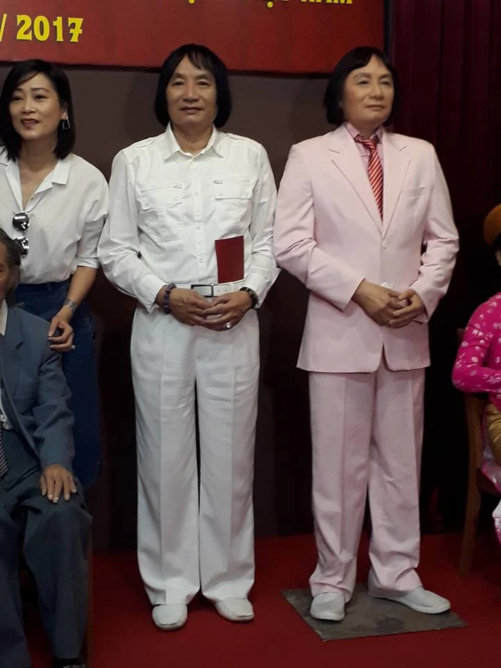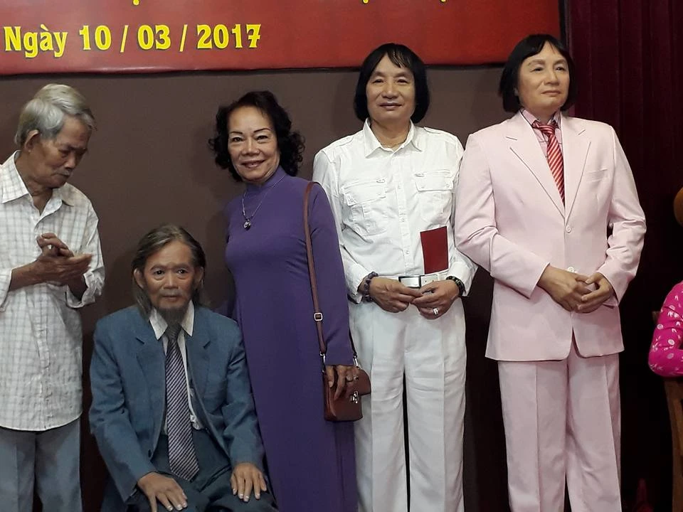 Đạo diễn Huỳnh Nga và vợ bên tượng của ông, kế bên là nghệ sĩ Minh Vương và tượng của tài danh này.