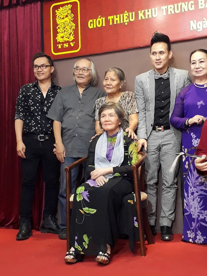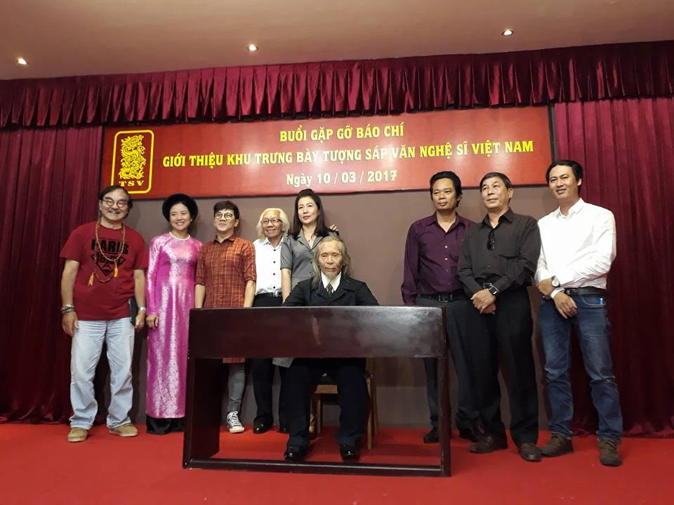 Các nghệ sĩ chụp ảnh cùng ba bức tượng (ngồi) của ba cố nghệ sĩ: Sầu nữ Út Bạch Lan, GS Trần Văn Khê, ông vua vọng cổ Viễn Châu.