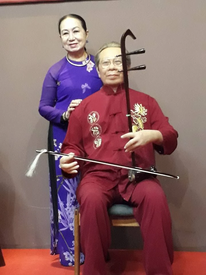 Ca sĩ Hồng Vân bên tượng GS Trần Văn Khê.