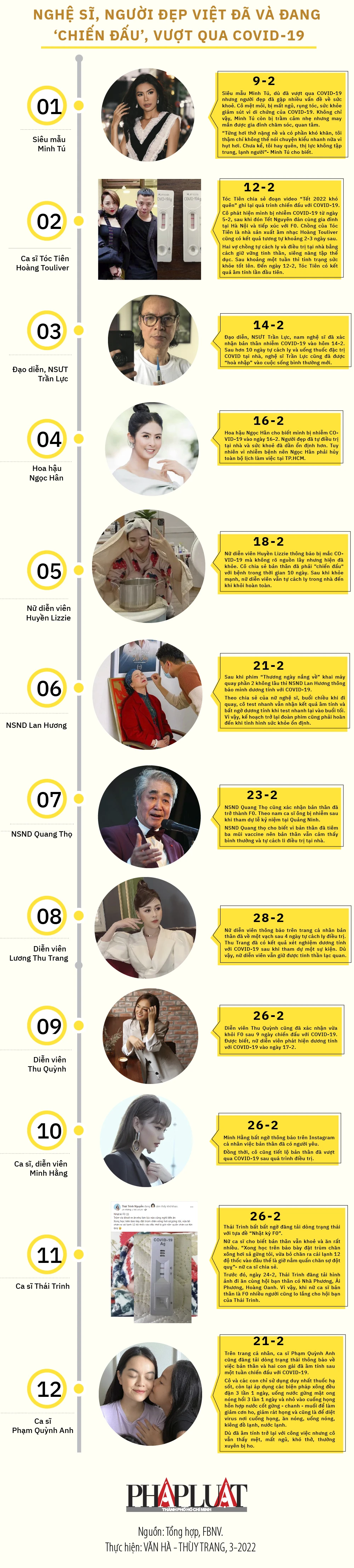 (PLO)- Thời gian qua, không ít nghệ sĩ Việt dương tính với COVID-19 khiến cho các hoạt động nghệ thuật bị gián đoạn, đóng băng. Trong đó, NSND Quang Thọ, Lan Hương, NSƯT Trần Lực, hoa hậu Ngọc Hân, ca sĩ Tóc Tiên, diễn viên Minh Hằng… đã dương tính với COVID-19.