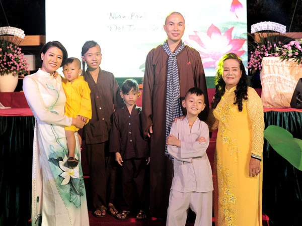 Người mẫu Trang Trần chụp ảnh cùng Đại đức Thích Minh Phú, là người chủ trì buổi tiệc chay từ thiện.