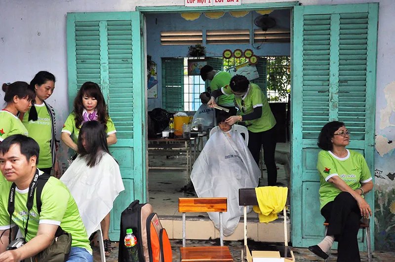 Ngoài ra, các thợ cắt tóc chuyên nghiệp từng được đào tạo từ các lớp học tại Nhà văn hóa Thanh niên cũng tình nguyện đến cắt tóc miễn phí cho các em học sinh. Ảnh: LINH BÙI