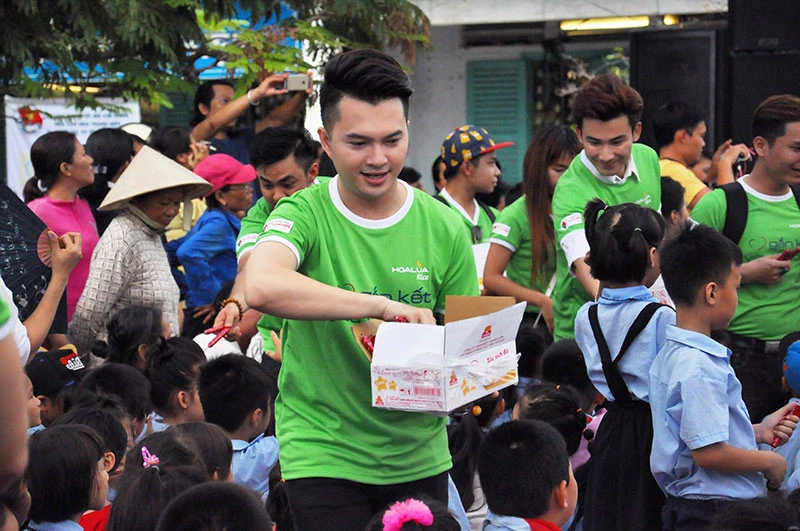 Ca sĩ Nam Cường cùng vợ mới cưới đến tham gia và vui vẻ phát quà cho các em học sinh. Ảnh: LINH BÙI