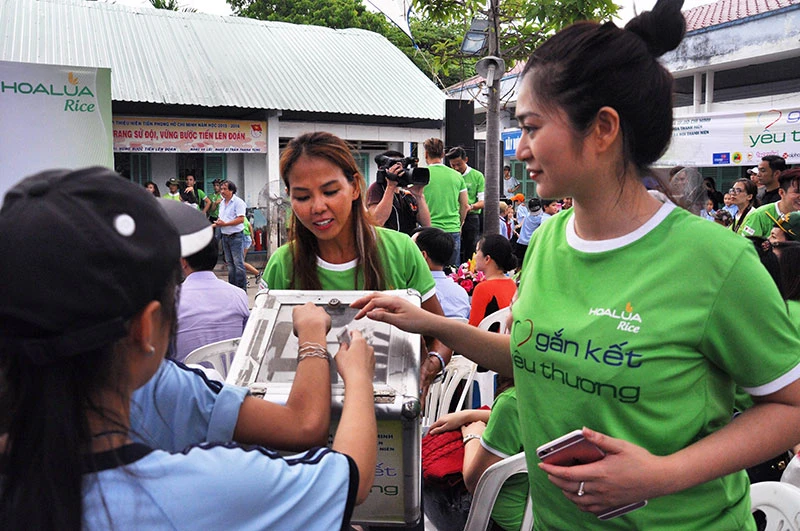 Ca sĩ Thúy Uyên và diễn viên Thanh Trúc đang làm nhiệm vụ nhưng vẫn không quên quyên góp cho em học sinh nghèo. Ảnh: LINH BÙI