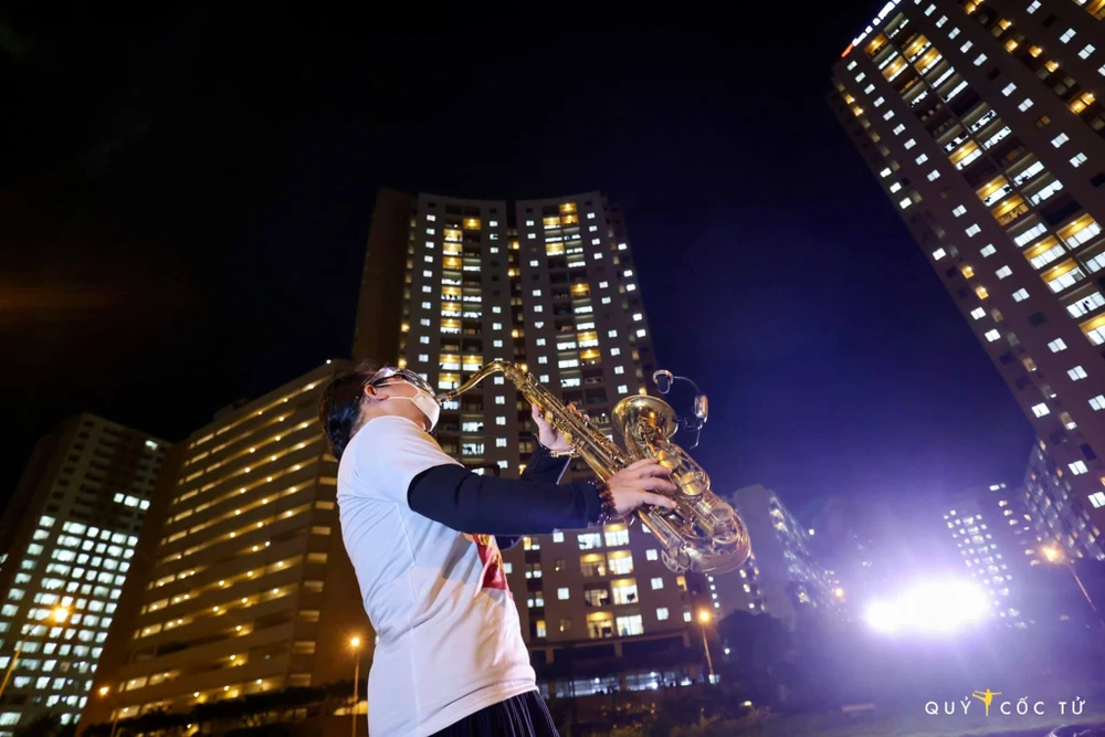 Nghệ sĩ Saxophone Trần Mạnh Tuấn biểu diễn tại bệnh viện dã chiến. Ảnh: QUỶ CỐC TỬ