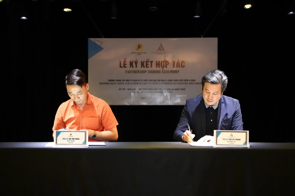 Nghệ sĩ Thanh Bùi, nhà sáng lập AMPA Education ký kết hợp tác cùng ThS Hà Thế Dũng, Hiệu trưởng trường Trung cấp múa TP.HCM.