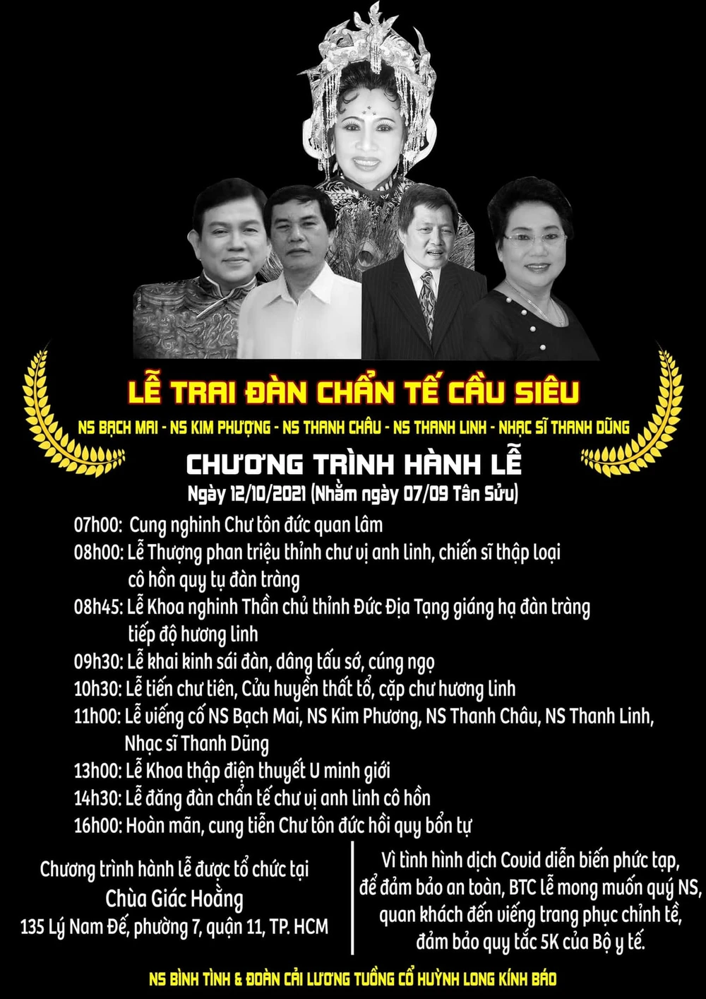Theo đó, Lễ trai đàn chẩn tế cầu siêu chung thất 49 ngày của Nghệ sĩ Bạch Mai cùng các nghệ sĩ: Nghệ sĩ Kim Phương, Nghệ sĩ Thanh Châu, Nhạc sĩ Thanh Dũng và Nghệ sĩ Thanh Linh sẽ được tổ chức tại Chùa Giác Hoằng (Quận 11, TPHCM) ngày 12-10 sắp tới (nhằm ngày 7-9 Âm Lịch).