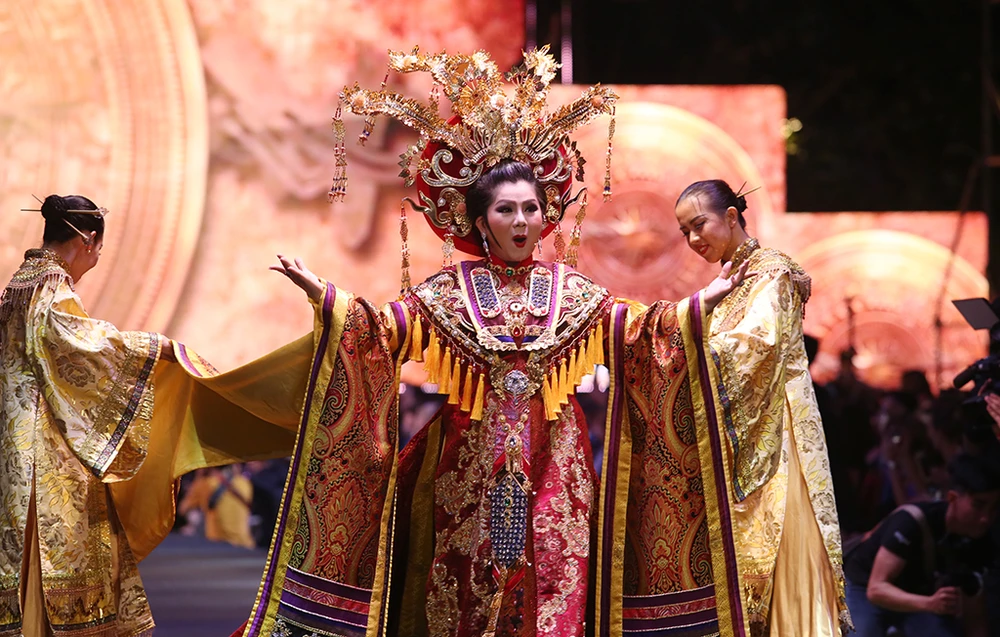 Nghệ sĩ cải lương Tú Sương lần đầu tiên trình diễn áo dài phong cách hoàng tộc của nhà thiết kế Lê Long Dũng.