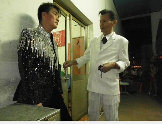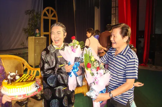 Bầu show Duy Ngọc tặng hoa chúc mừng nghệ sĩ cải lương Vũ Linh.