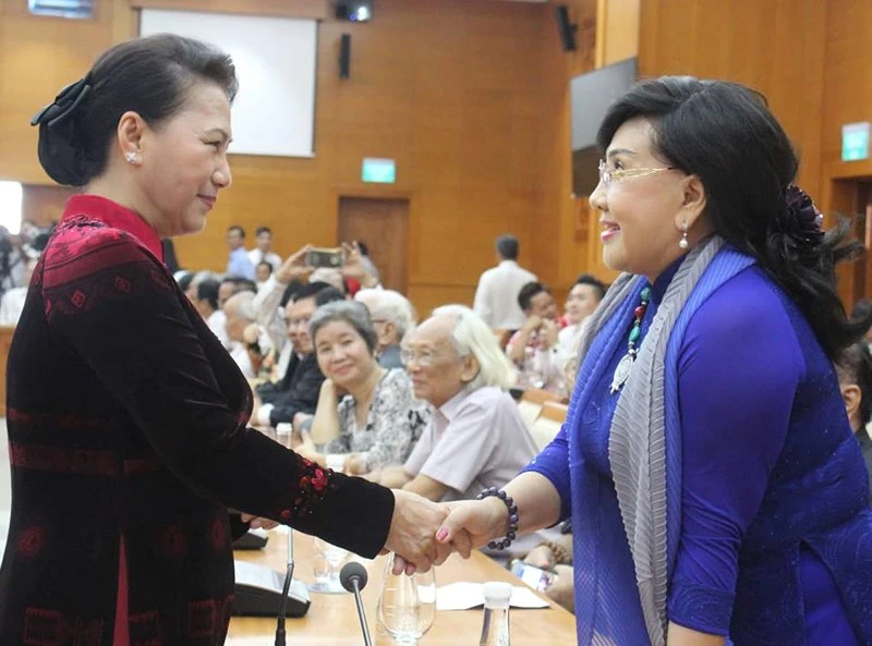 Chủ tịch Quốc hội Nguyễn Thị Kim Ngân chào hỏi NSND Lệ Thủy. Ảnh: Ngọc Tuyết.