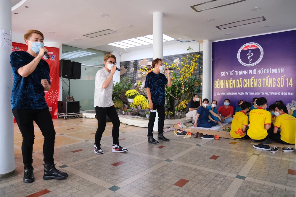 Chiều nay (28-1, tức 26 Tết), khác hẳn với không khí trầm lắng ngày thường, không khí ở bệnh viện dã chiến số 14 rộn ràng hẳn lên bởi sự xuất hiện của các nghệ sĩ tình nguyện, sinh viên trường Đại học Nguyễn Tất Thành.