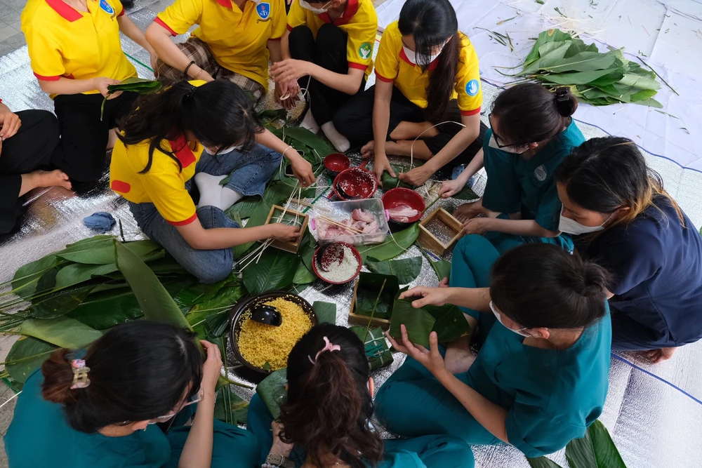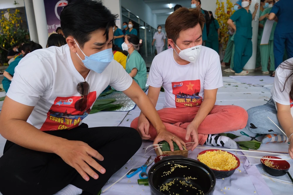 Nghệ sĩ gói bánh chưng cùng các y bác sĩ, sinh viên trường Đại học Nguyễn Tất Thành