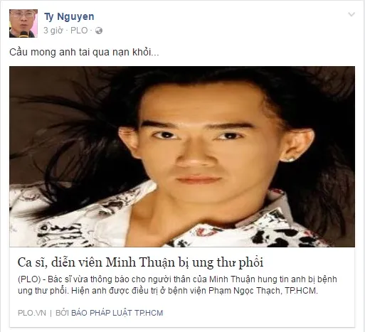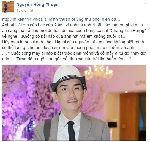 Hôm nay, ngập tràn mạng xã hội là những dòng tâm sự, chia sẻ đau xót, bàng hoàng khi biết tin Minh Thuận bị chẩn đoán ung thư phổi, hiện đang tai biến và hôn mê sâu. Anh hầu như không nói được, chỉ có thể viết hoặc ra dấu.