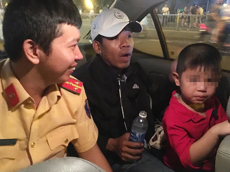 Ngày 2-9, CSGT đưa bé trai năm tuổi đi dọc đường Tôn Đức Thắng và phát loa để tìm mẹ cho bé bị đi lạc khi xem bắn pháo hoa, sau hơn 10 phút hai mẹ con đã được đoàn tụ. Ảnh: HK