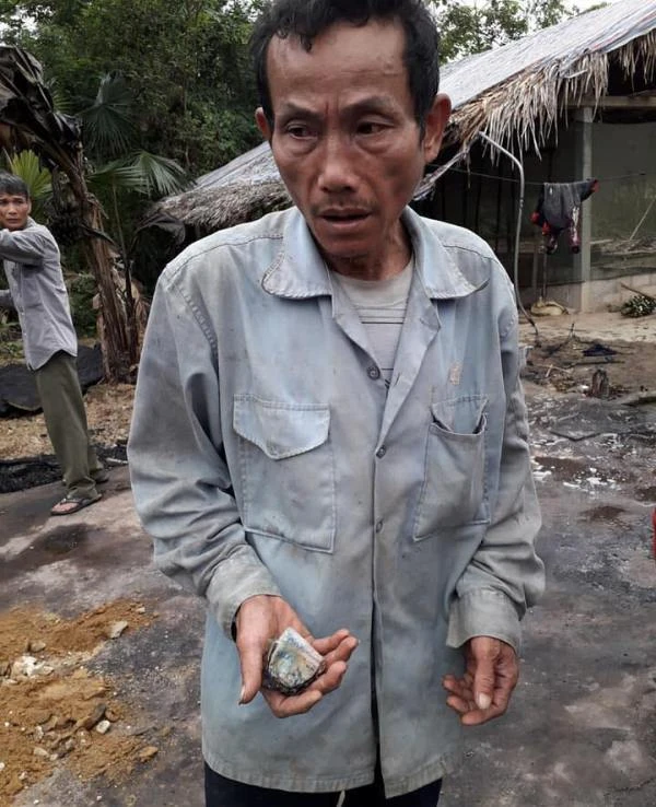 Ông Bình nói trong nước mắt: “Không chỉ cháy hết nhà cửa mà toàn bộ tài sản và 12 triệu đồng cất trong nhà bị cháy hết. Tôi vừa đi nhận được 2 triệu đồng tiền Nhà nước trả cho chế độ chính sách dân công hỏa tuyến của bố tôi và đã cất để cúng lên bàn thờ bố thì bị cháy gần hết bốn tờ tiền. Vợ chồng tôi mua nợ gà con giống và nợ thức ăn cho gà, nuôi gà lớn lên bán được 10 triệu đồng chưa kịp đi trả cũng bị cháy thành than hết rồi. Giờ chúng tôi tay trắng, không có tiền để mua gạo, dựng lại nhà mà lâm vào nợ nần”.