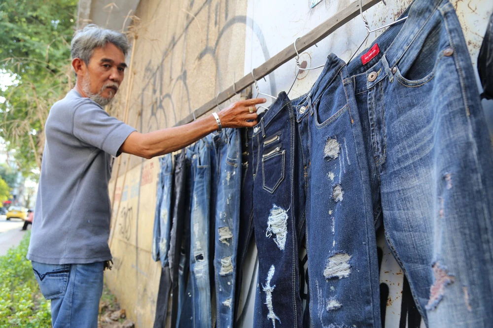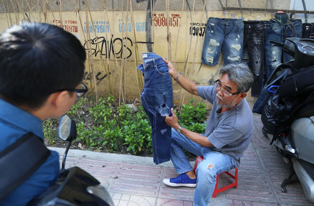 Không những tạo kiểu cho những chiếc quần jeans khách mang đến, ông Viễn còn tậu riêng cho mình một góc trưng bày những chiếc quần jeans cũ được ông mua về rồi tự thiết kế các mảng xé khác nhau, treo ở bờ tường dọc vỉa hè để bán cho khách có nhu cầu.