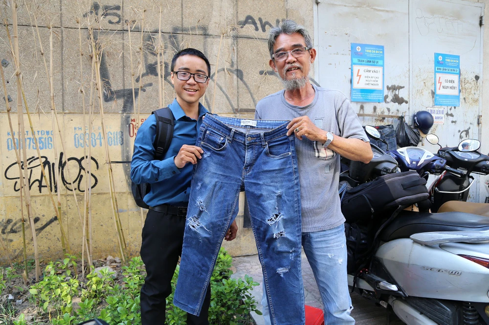 Anh Đặng Thanh Hoàng (quận Tân Bình, TP.HCM) tranh thủ sau giờ làm mang chiếc quần jeans đến nhờ ông Viễn tạo kiểu. "Thực ra thì mình thấy quần jeans còn mới chỉ là có một lỗ thủng nhỏ nhìn không ưng, nên tìm đến đây nhờ chú Viễn "xé" thêm vài lỗ nữa cho đẹp. Đó giờ nhìn thấy nhiều quần jeans được tạo kiểu như này nhưng đến bây giờ mới được tận mắt nhìn thấy chú Viễn làm"- Anh Hoàng chia sẻ.