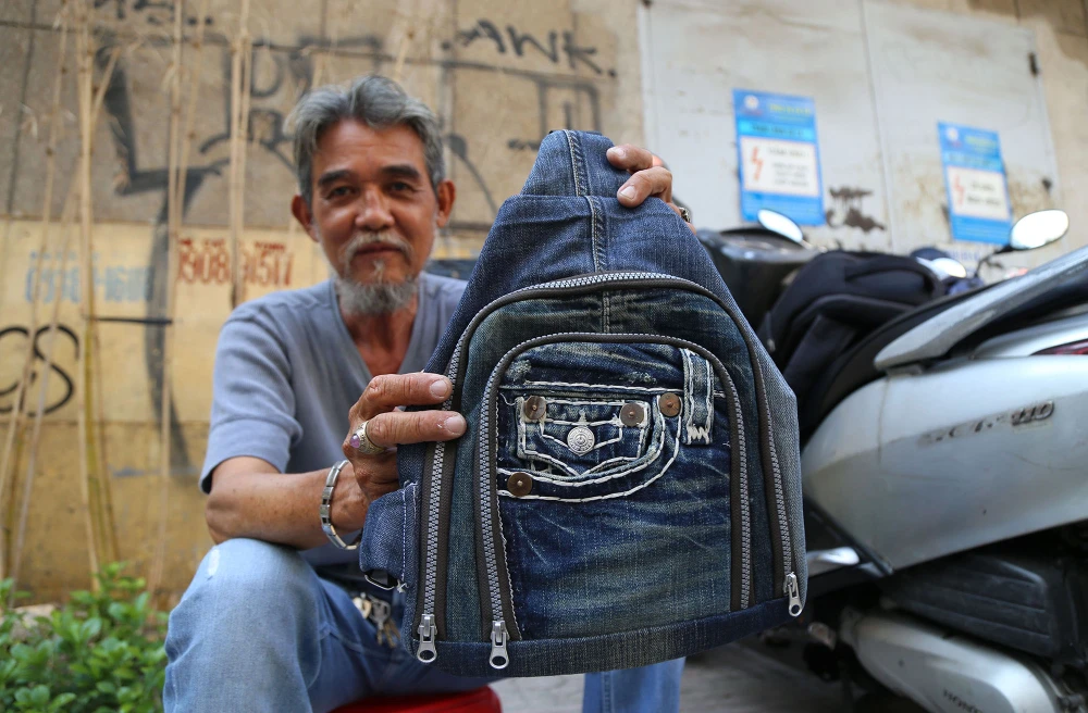 Ngoài xé quần jeans, ông Viễn còn nhận may túi xách, balo từ những chiếc quần jeans cũ. Mỗi chiếc túi có giá dao động từ 250 ngàn đến 300 ngàn đồng.