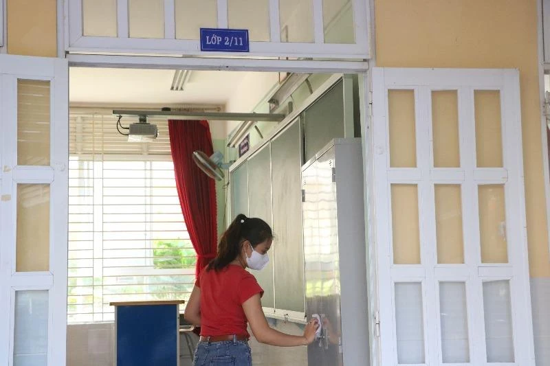 Các giáo viên thường xuyên làm vệ sinh trường lớp để đón học sinh khi có quyết định cho đi học lại. Ảnh: LÊ ÁNH