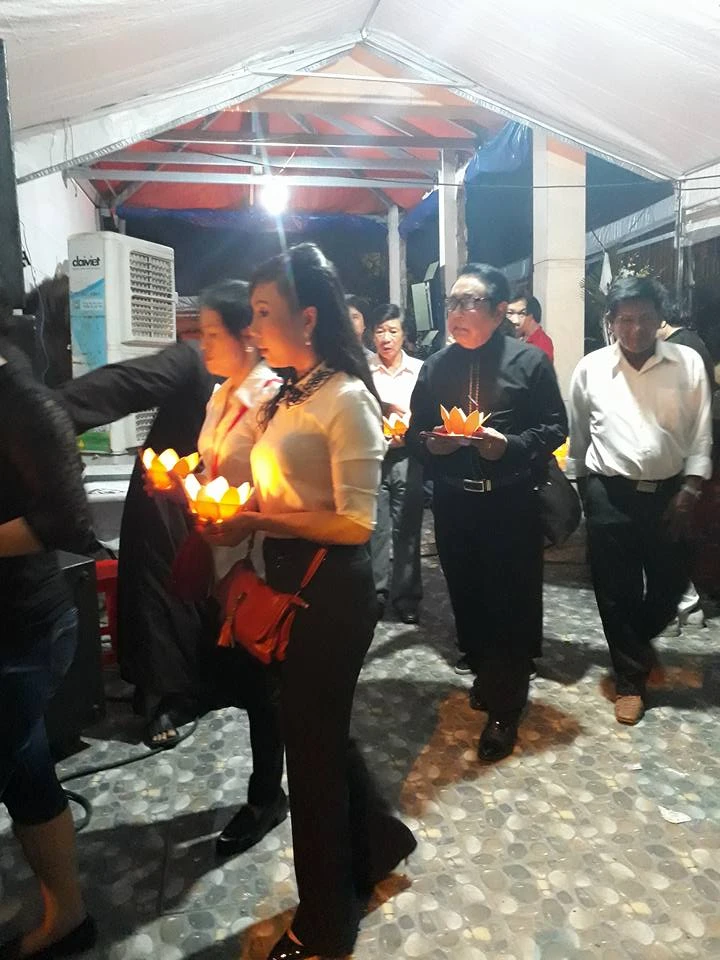 Các nghệ sĩ cầm hoa đăng đi vòng quanh linh cửu cầu nguyện.