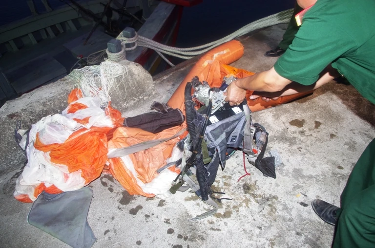 Quần áo phi công, dù và vật dụng của Thượng tá phi công Khải đưa lên bờ.