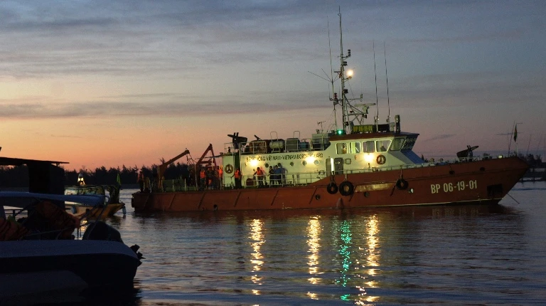 Do thủy triều xuống nên tàu chở thi thể Thượng tá phi công Khải phải neo phía ngoài để đưa ca nô ra chở vào.