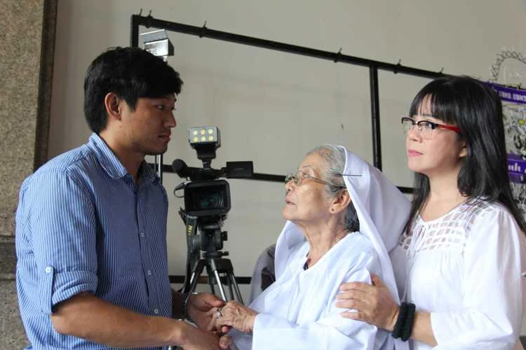 Ca sĩ Ánh Tuyết cùng diễn viên Qúy Bình thăm hỏi NSƯT Phi Điểu. Ảnh: Hoàng Giang