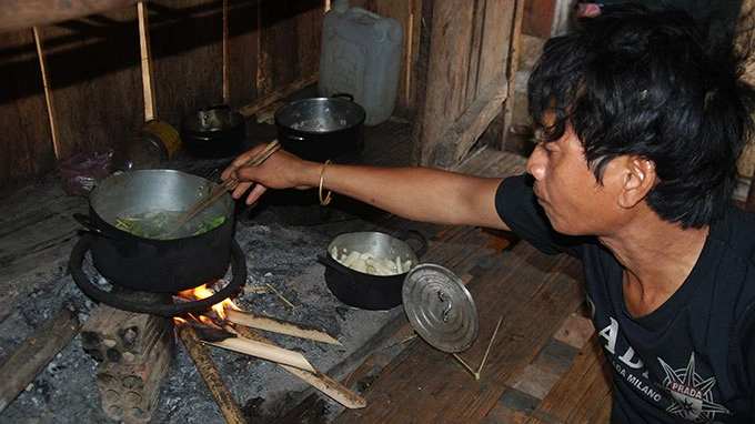 Trong khi đó, căn nhà của ông Đinh Văn Nang (45 tuổi) nằm ở cuối khu TĐC vắng lặng. Một mình ông đang lúi húi sau nhà với mớ rau rừng. Thấy khách, ông Nang thanh minh: “Hết tiền rồi, hái rau rừng luộc ăn với sắn”. Cũng giống như các hộ Ca Dong trong khu TĐC, cuộc sống ông Nang thay đổi chóng vánh khi được di dời và nhận tiền đền bù. Nhìn nồi sắn, nồi rau rừng bốc hơi nghi ngút trên bếp, ông Nang kể: “Được nhận hơn 400 triệu đồng tiền đền bù, trả tiền làm nhà gần hết. Còn một ít tiền thì vợ bị tai nạn giao thông phải thanh toán phí nằm viện hết nhưng vợ vẫn chết”.