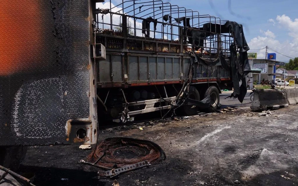 Hai chiếc xe tải bị cháy nặng sau cú đâm xe của ông Ngô Chung