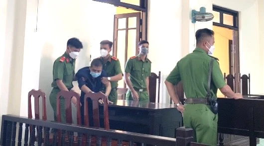 Bị cáo Nhân và Hải bị bệnh không thể tự đi, đứng, phải nhờ sự hỗ trợ của cán bộ hỗ trợ tư pháp. Ảnh: HD