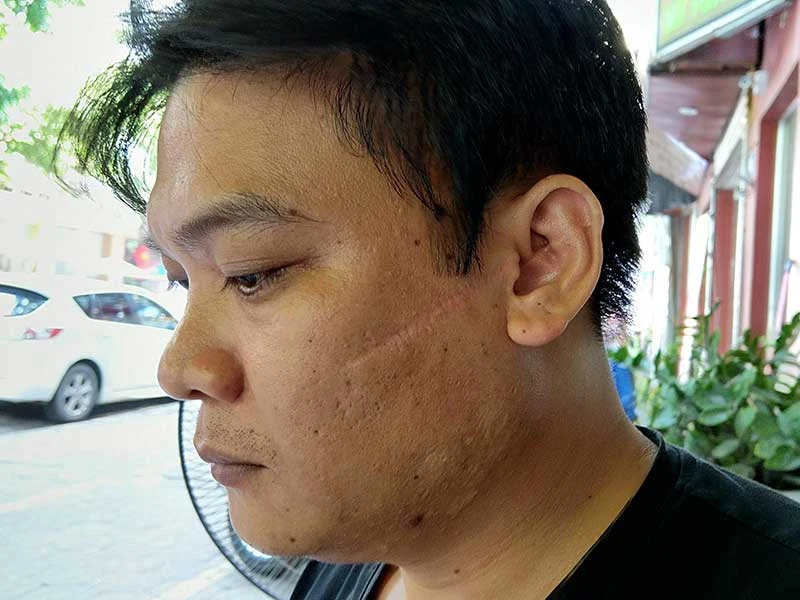 Người bị hại Trần Văn Đức cho rằng nhóm bị cáo chém rách mặt anh để chiếm đoạt chiếc xe máy. Ảnh: HUY HOÀNG