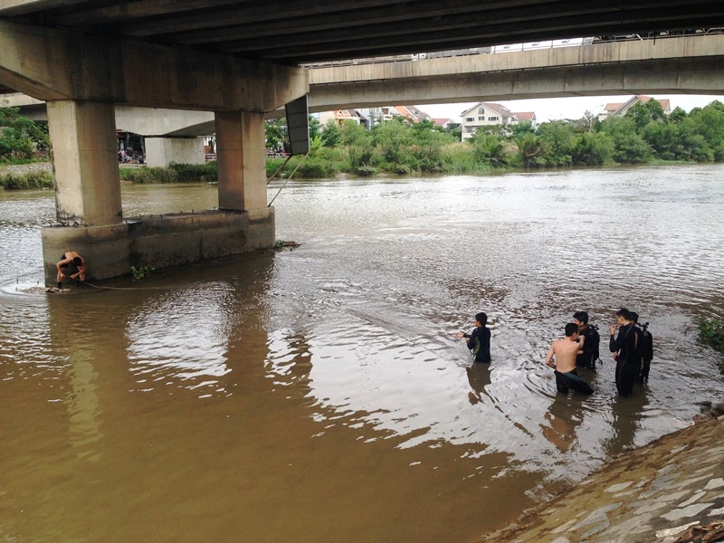 Nhiều người nhái đã lặn tìm ông D., trong điều kiện nước lớn nên công tác tìm kiếm gặp nhiều khó khăn.