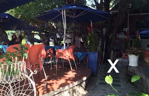 Vị trí nạn nhân gục ngã (dấu X). Ảnh: MINH HOÀNG Cách xếp bàn trong quán.