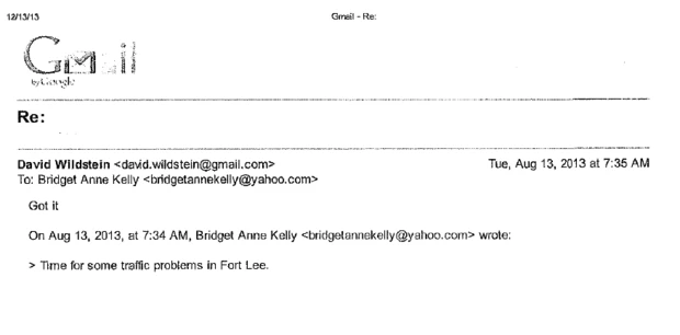 Trong một thư điện tử, Phó Chánh văn phòng Anne Kelly nói với ông David Wildstein, Phó Giám đốc cảng vụ Port Authority (quản lý hoạt động của cơ sở hạ tầng giao thông địa phương) do Thống đốc Chris Christie bổ nhiệm là “đã đến lúc tạo ra một số trắc trở giao thông tại Fort Lee”. Ông David Wildstein trả lời đồng ý.