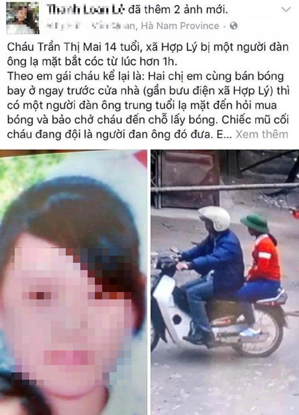 Trước đó, Facebook đăng tải một loạt hình ảnh kèm theo thông tin về vụ việc nghi bắt cóc xảy ra vào ngày 19-2, tại xã Hợp Lý, huyện Lý Nhân, Hà Nam.
