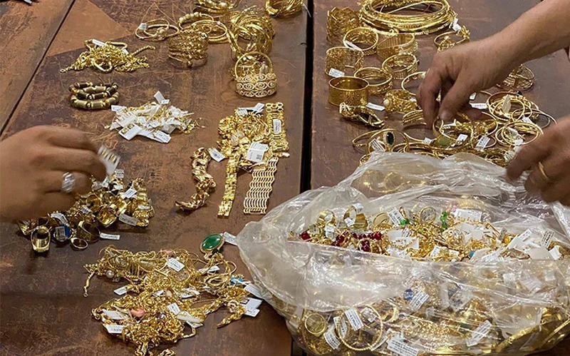 Sau đó, nghi phạm dùng dụng cụ mang theo cạy gỡ tấm kính bên trên tủ trưng bày lấy đi toàn bộ số vàng trong tủ.
