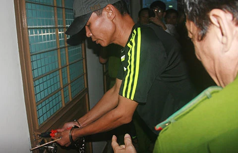 Hùng đang diễn lại cách bẻ khóa phòng làm việc. Ảnh: LT