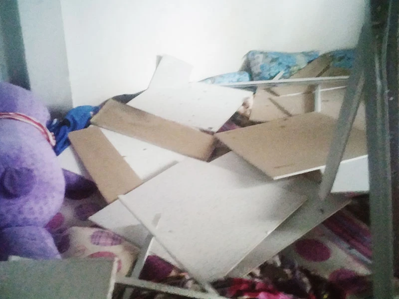 Sức ép từ vụ cháy nổ, khiến một ngôi nhà bên cạnh bị sập la phông, đè trúng một phụ nữ 51 tuổi làm người bà này bị thương nhẹ.