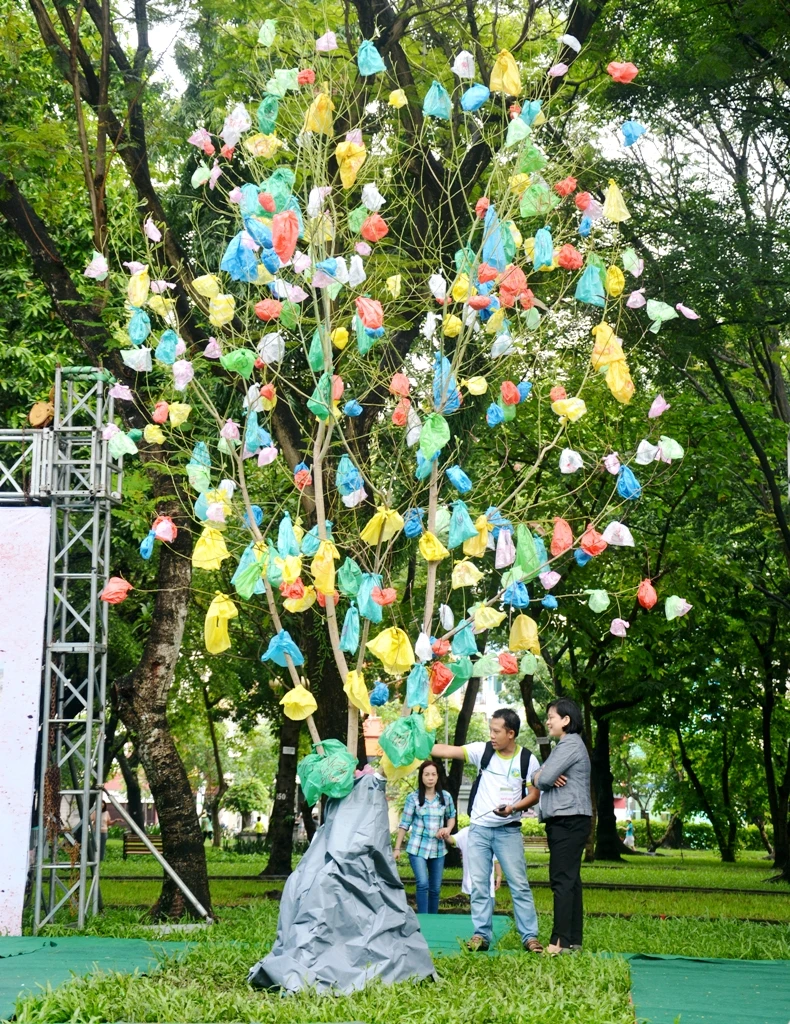 Túi nylon bị mắc vào các cành cây là lời cảnh bá về ô nhiễm được trưng bày tại Ngày hội Sống xanh TP.HCM. Ảnh: MINH TÚ