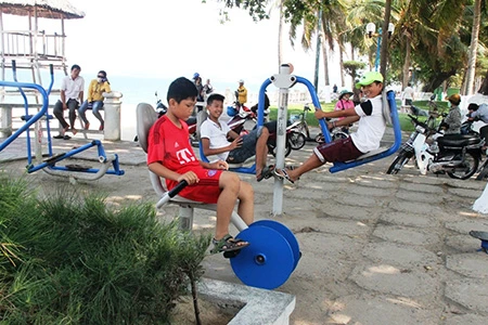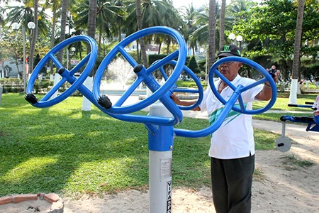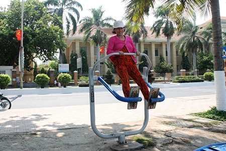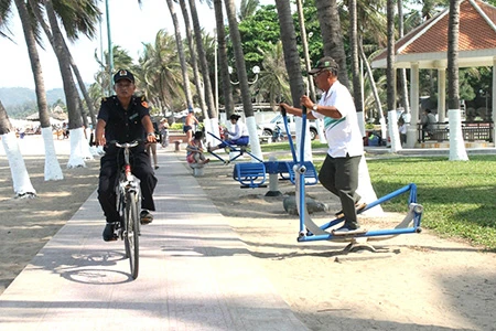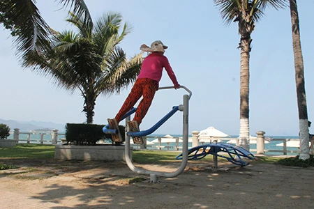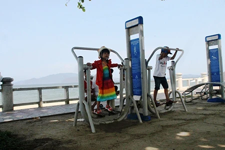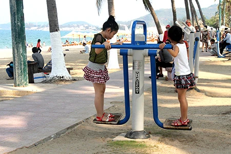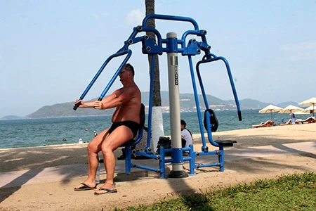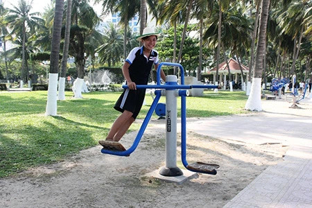 Những dụng cụ thể dục được đặt ở bờ biển Nha Trang để du khách và người dân địa phương có thể tập vào bất cứ thời điểm nào. Ghi nhận của chúng tôi từ đường Phạm Văn Đồng (phường Vĩnh Hải), cho đến tận công viên Bạch Đằng, đường Trần Phú (Vĩnh Nguyên), có rất nhiều khách người nước ngoài, trẻ em, người cao tuổi… tập luyện. Ai cũng say mê và hồ hởi luyện tập đơn, hoặc vài người cùng tập.
