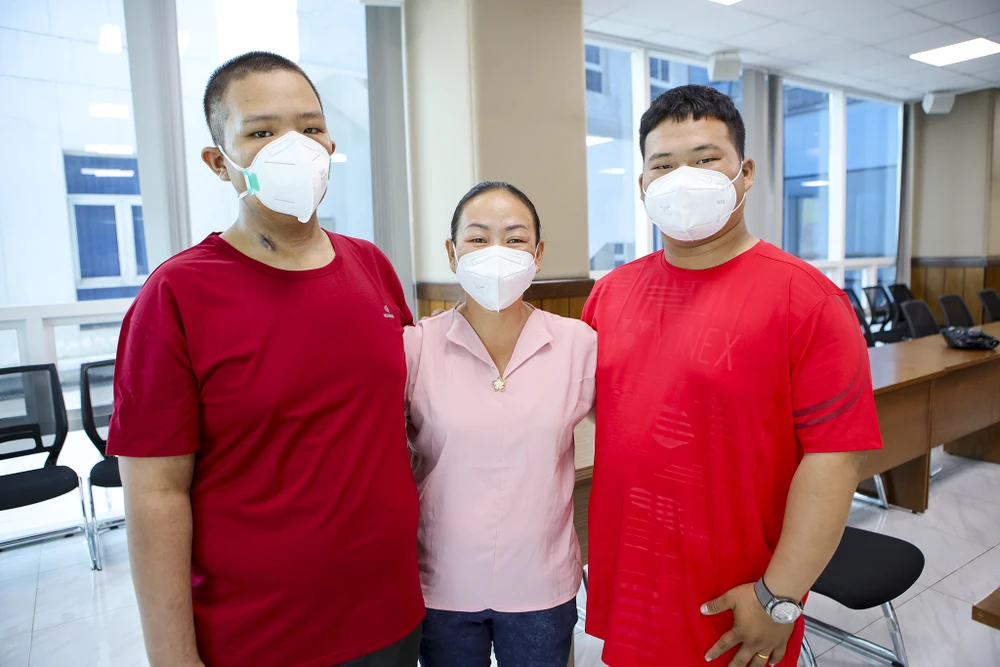 P (bìa trái) cùng mẹ và anh trai đoàn tụ sau những ngày chiến đấu với bệnh tật.