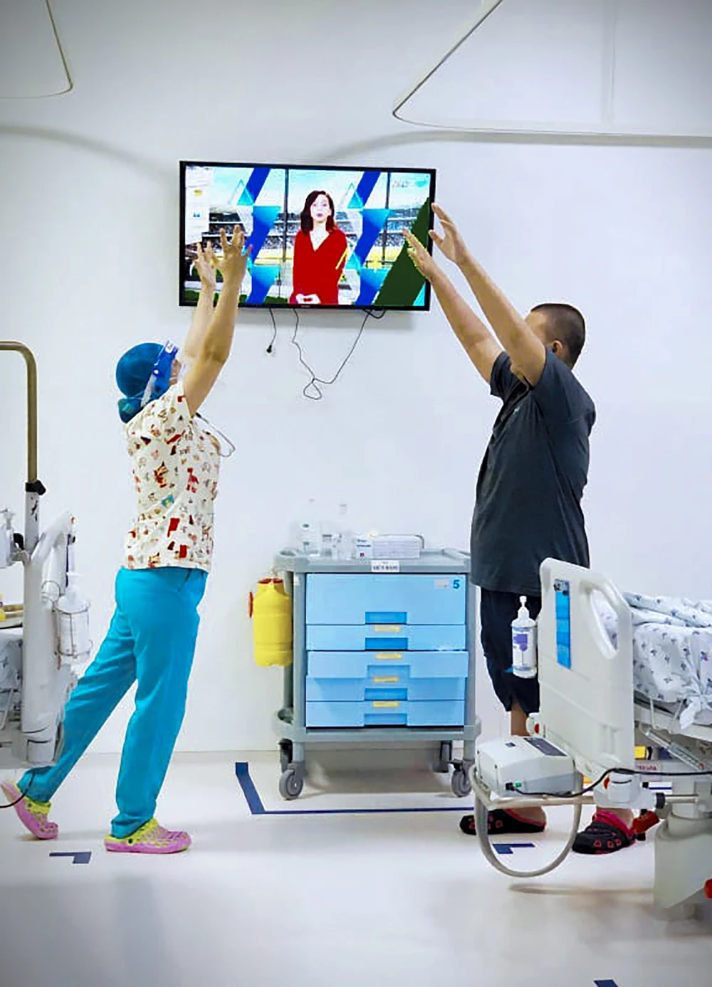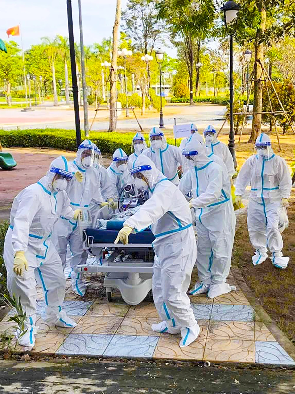 Một số hình ảnh khi P được điều trị tại bệnh viện. Trong ảnh: Các y bác sĩ di chuyển P từ khoa nhiễm sang khoa hồi sức tích cực chống độc cùng với thiết bị ECMO, tổng cộng gần 500kg.