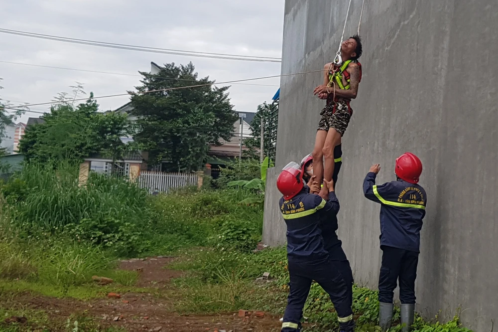 Sau gần 30 phút tiếp cận hiện trường, lực lượng công an đã khống chế được người đàn ông đưa xuống đất an toàn.