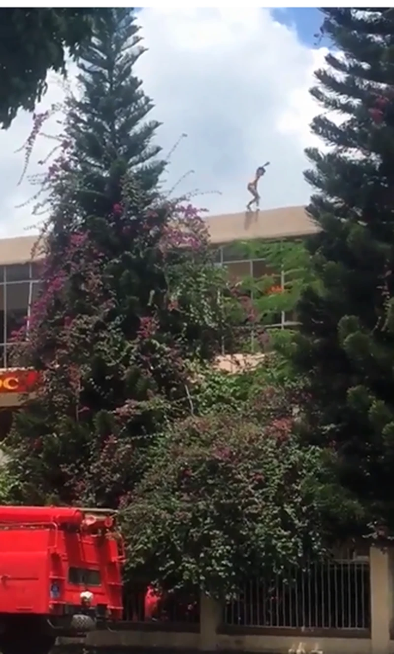 Thanh niên la hét trên nóc trụ sở công an TP. Bảo Lộc, tỉnh Lâm Đồng.